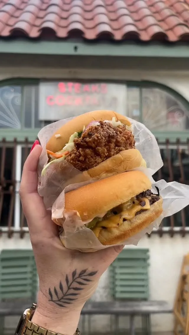 hand holding fried chicken sandwich in front of a mural of the Win~Dow logo