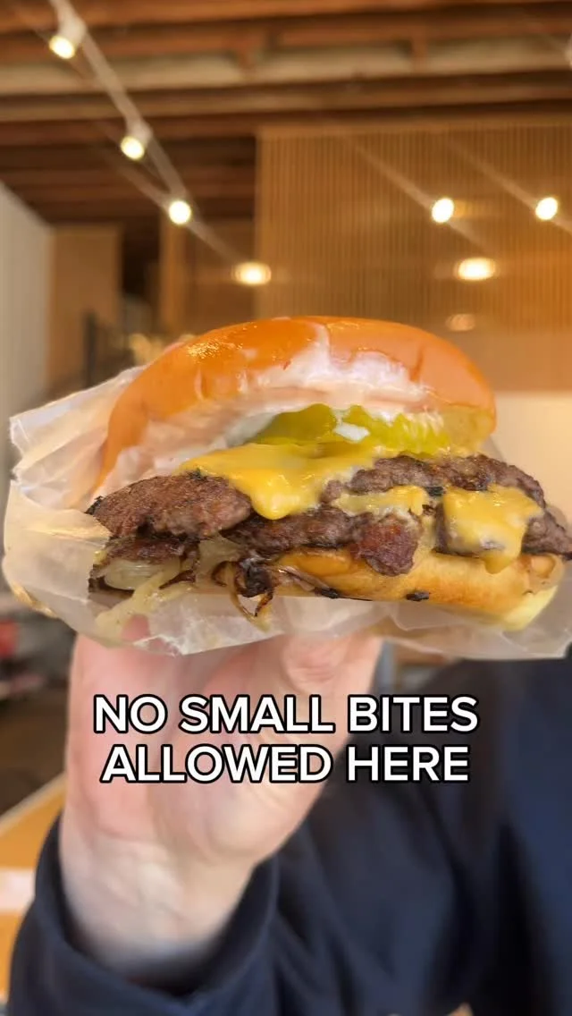 double cheeseburger in front of the Win~Dow logo