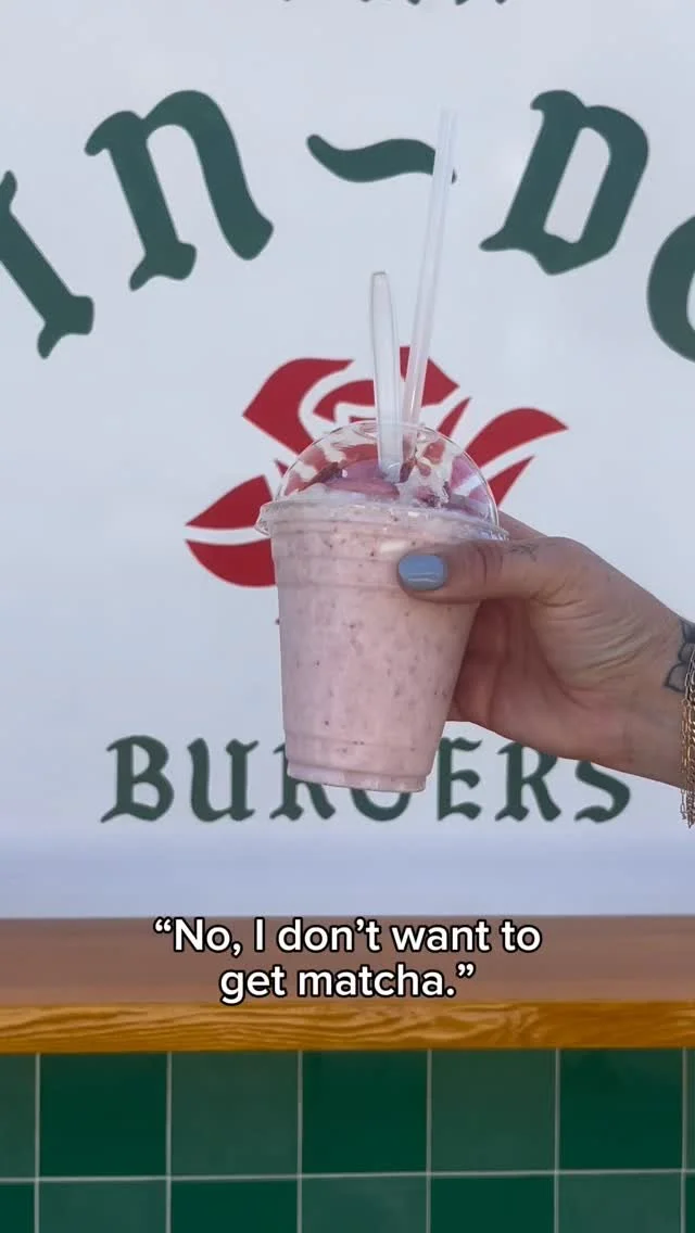hand holding a chocolate smores milkshake in front of an ice cream sign