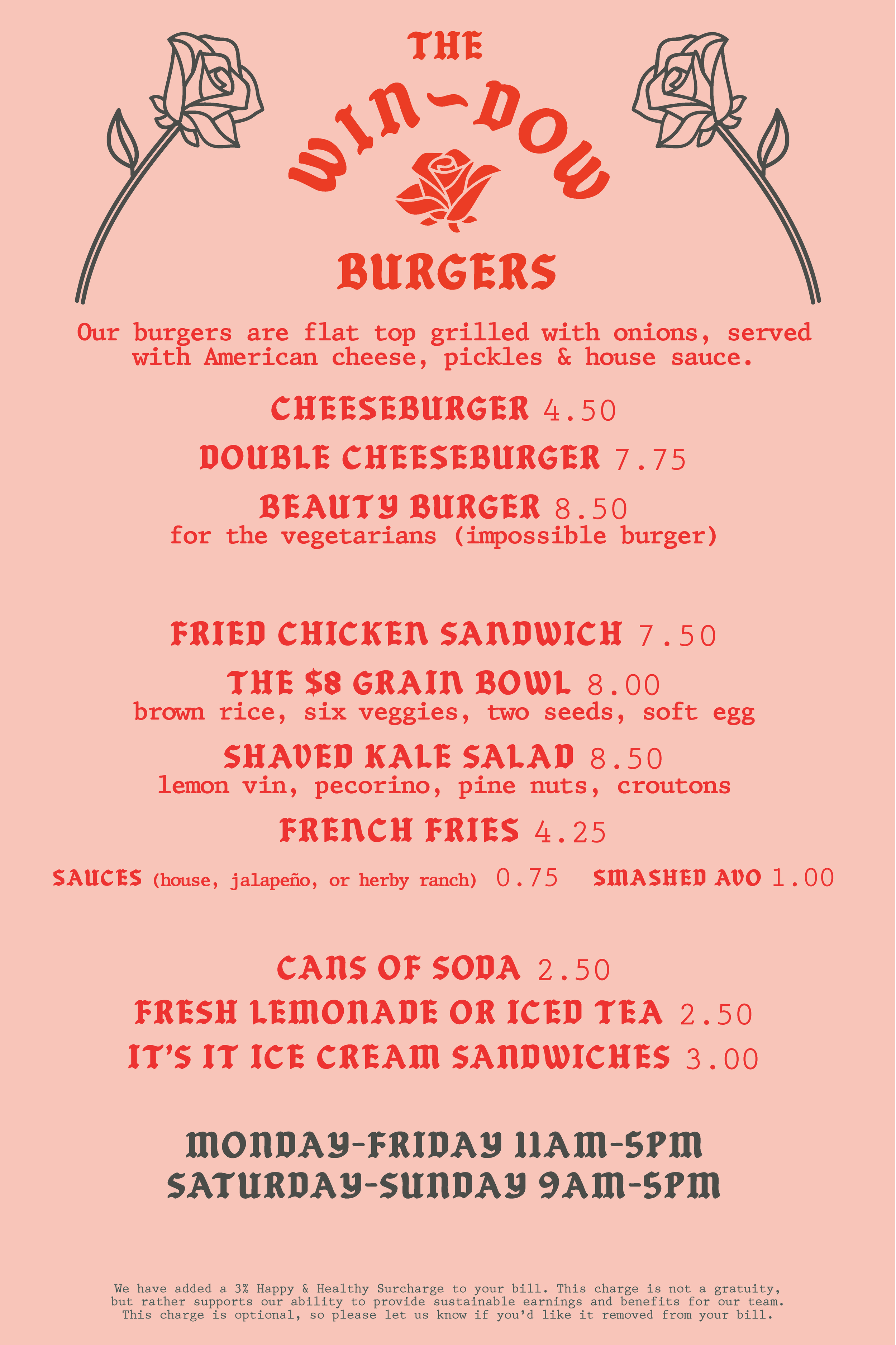 We have added a 3% Happy and Healthy Surcharge to your bill. This charge is not a gratuity, but rather supports our ability to provide sustainable earnings and benefits for our team. This charge is optional so please let us know if you’d like it removed from your bill.
